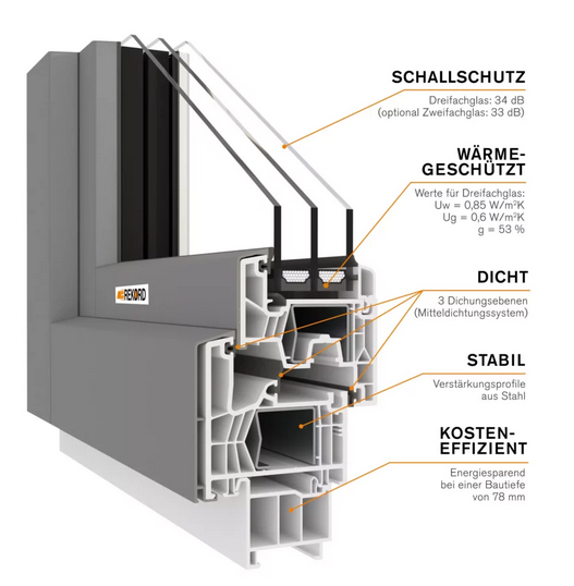 Ein Schallschutz von 35 dB sorgt für ein angenehmes und ruhiges Wohnambiente. Eine Dreifachverglasung sowie drei Dichtungsebenen machen das Fenster komplett.