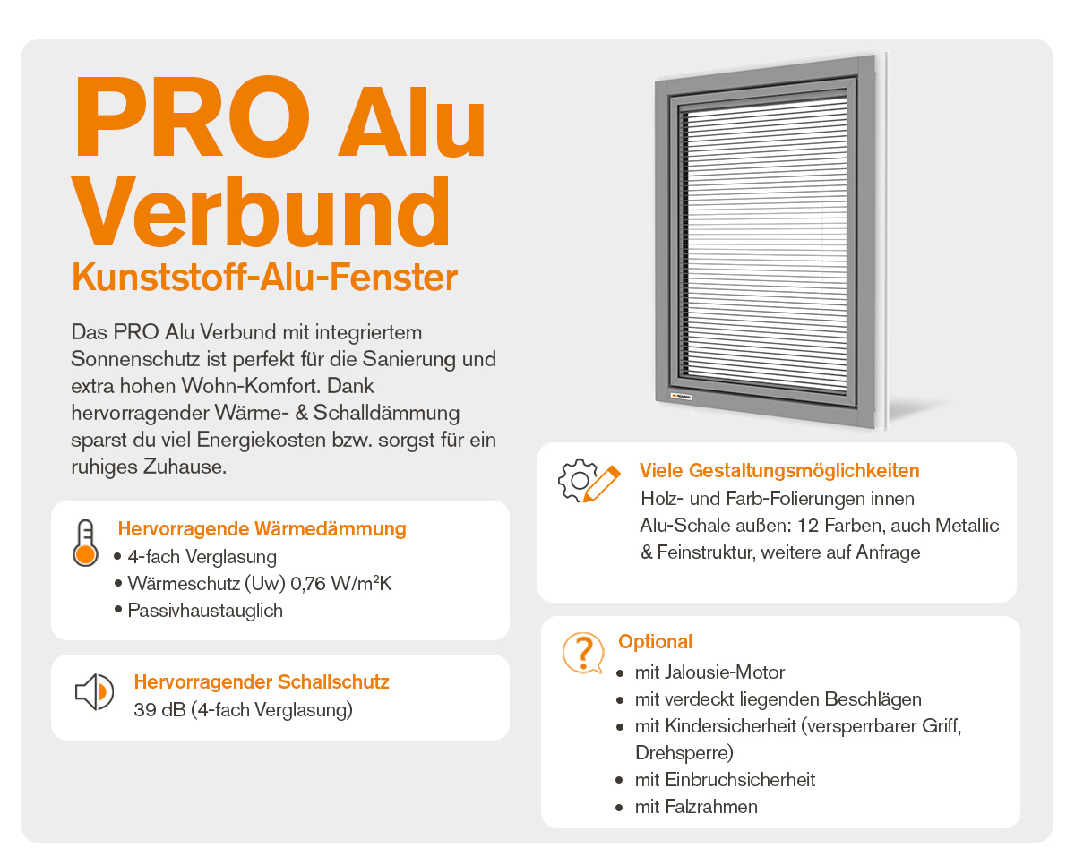 Unser absoluter Alleskönner ist das PRO Alu Verbund. Mit top-Schall- und Wärmeschutzwerten und integrierter Jalousie bietet das Kunststoff-Alu-Fenster PRO Alu Verbund das volle Gesamtpaket und eignet sich hervorragend für Sanierungen, da hier häufig der Platz für einen Rollladen- bzw. Raffstore-Kasten fehlt.