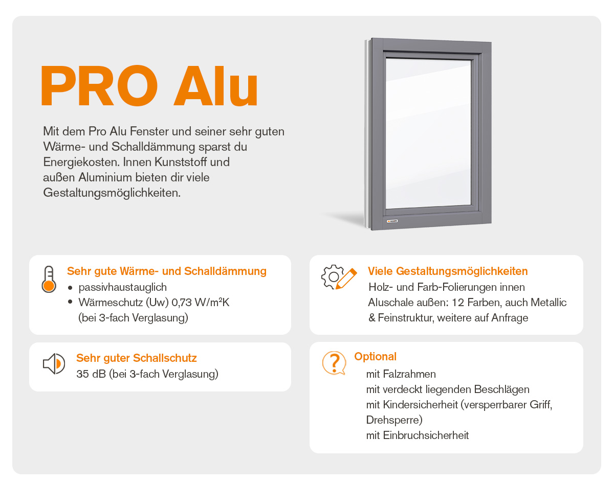 Unser Kunststoff-Alu-Fenster PRO Alu bietet mehr. Mehr Dämmung machen es passivhaustauglich und sehr energieeffizient. Die hochwetterfeste Alu-Schale ist besonders pflegeleicht und in verschiedenen Farben erhältlich.